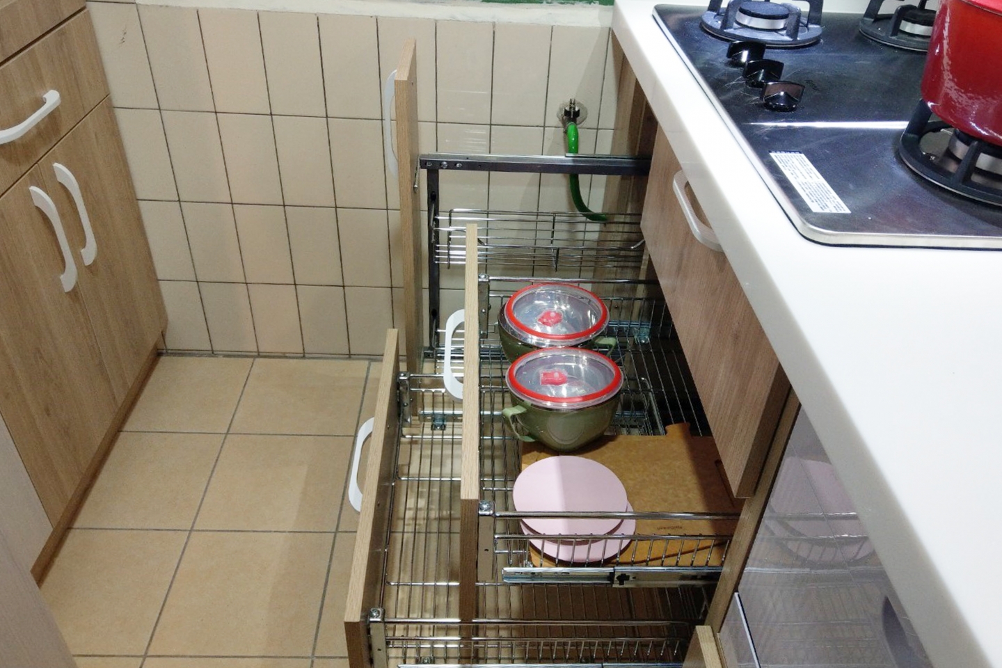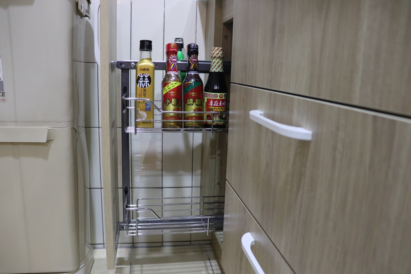 ▲側拉櫃、碗盤籃為調味罐、大型鍋具以及多種碗盤找到容納之處,輕鬆好拉方便收納。